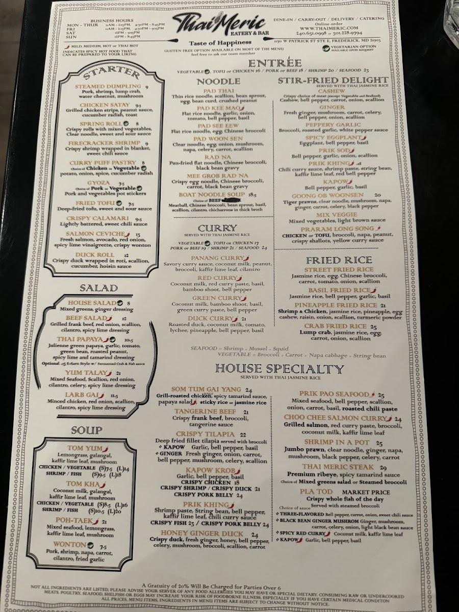 Welcome to Thai Meric Eatery & Bar, a delightful destination at 1170 W Patrick St, Frederick. This vibrant eatery combines authentic Thai flavors with an inviting atmosphere, making it perfect for both quick lunches and relaxed dinners.